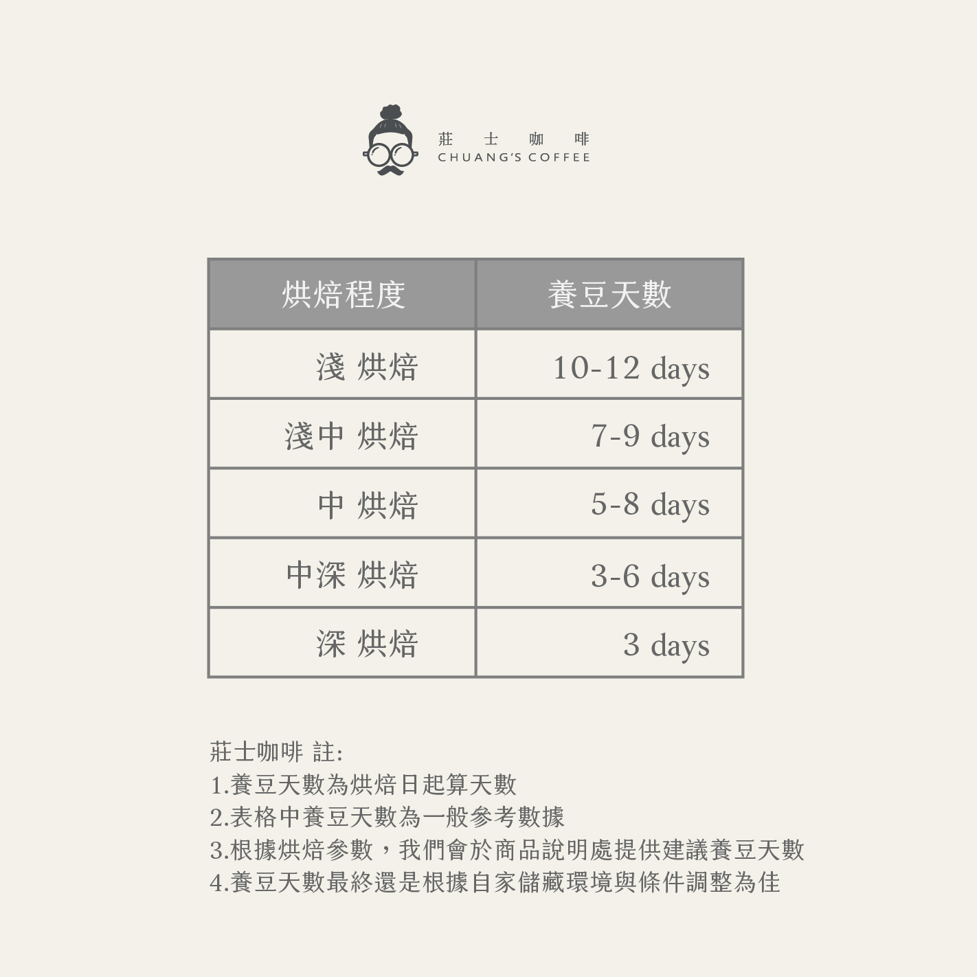 養豆期長短可根據烘培程度來判斷,淺培豆烘培的過程短、溫度低,產生的氣體較少,但因為豆體組織完整排氣緩慢,所以需要較長的養豆期;相反的雖然深培豆產生的氣體較多,但因為豆體組織有更多裂縫,有助於氣體釋放所以養豆期較短。可參考以下養豆建議表: